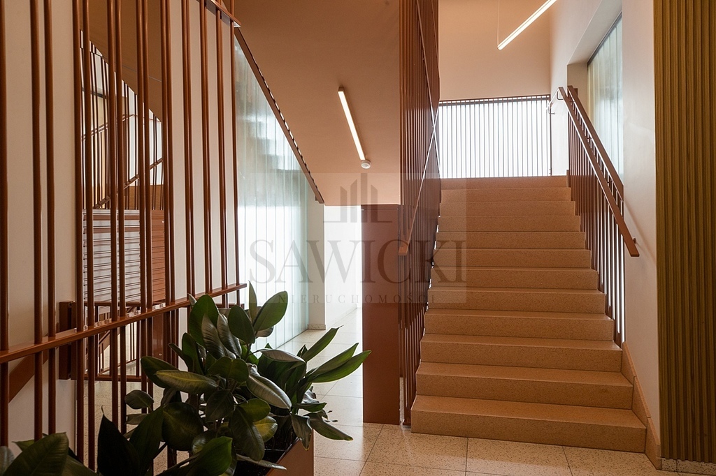 Mieszkanie współcześnie zaaranżowane na drugim piętrze z balkonem.